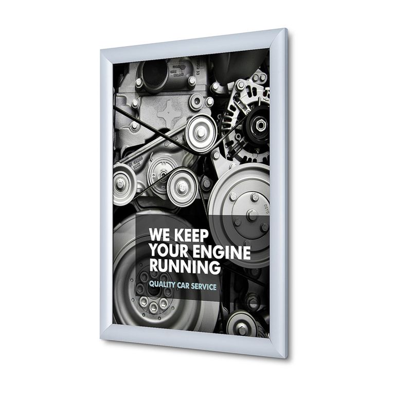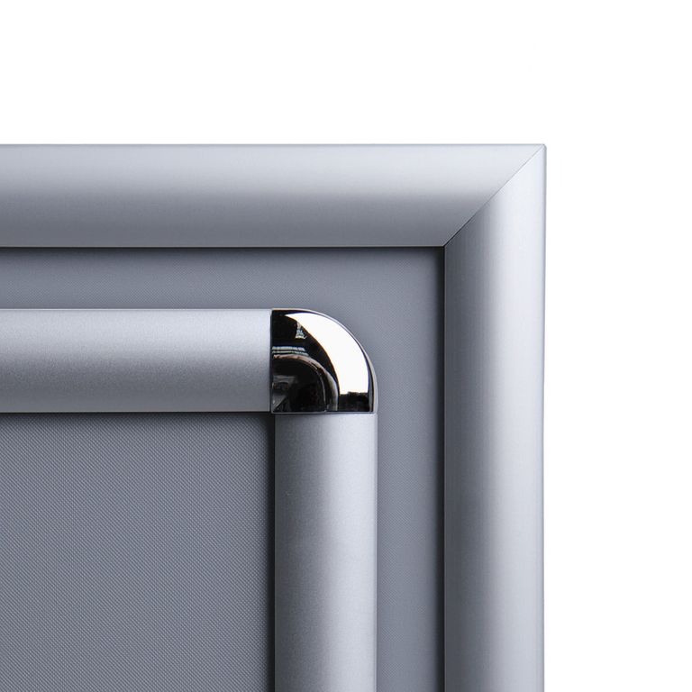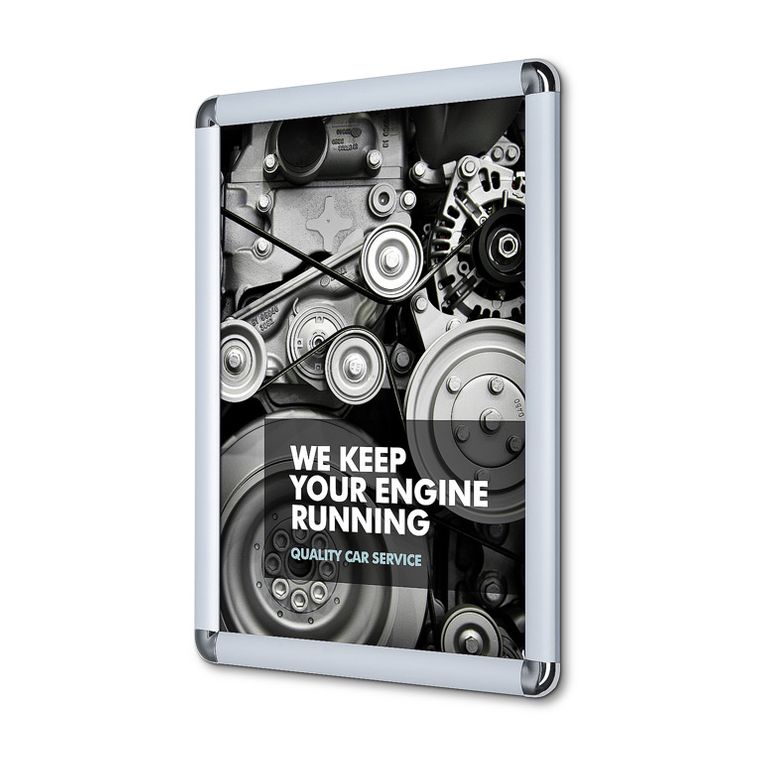 Der Klapprahmen verfügt über eine schlagfeste Kunststoffrückwand. Seine hochwertigen Aluminium-Profile sind silber eloxiert und wahlweise mit Ecken „auf Gehrung“ oder Rondo-Ecken erhältlich. Zudem befindet sich im Lieferumfang eine UV-beständige Antireflex-Folie, durch die Ihre Werbebotschaft trotz Lichteinfall lesbar bleibt und sie vor dem Ausbleichen schützt.
