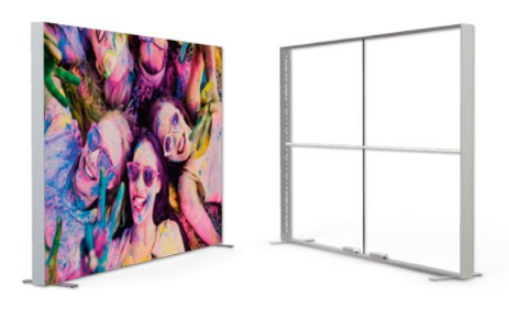 Der MULTIframe SIDELIGHT von AR Display in Berlin ist ein vollflächig hinterleuchteter LED Rahmen mit einer Bautiefe von nur 12-16 cm (bis 200 cm Höhe: 12cm, ab 250cm Höhe: 16cm Bautiefe). Das einseitig und doppelseitig verwendbare Aluminiumrahmenprofil eignet sich dank der stabilen Füße hervorragend für den Einsatz als Raumteiler. Durch die spezielle Linsenform der LED Module kann man trotz der schmalen Bautiefe keinerlei Lichtpunktbildung auf der Stoffoberfläche entdecken – das Motiv wird einheitlich und schattenfrei dargestellt. Die Stoffgrafiken sind mit Gummilippen versehen, die ihnen einen perfekten Halt im Rahmensystem ohne Falten geben. Darüber hinaus ist mit diesem System ein einfacher und rascher Grafikwechsel möglich. Nicht nur die Leuchtkraft von ca. 5000 lm, sondern auch die homogene Ausleuchtung machen den MULTIframe SIDELIGHT zu einem Leuchtrahmen, der alle ähnlichen Produkte in den Schatten stellt. Alle Systemteile sind auch als Einzelteile erhältlich.