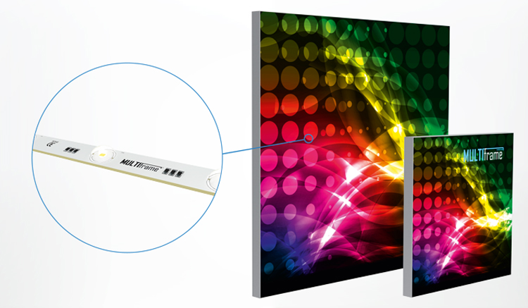 Der MULTIframe SUPER SLIM von AR Display in Berlin ist ein vollflächig hinterleuchteter LED Rahmen mit einer Bautiefe von nur 35 mm. Das einseitig verwendbare Aluminiumrahmenprofil ist superflach und eignet sich hervorragend für Wandmontagen. Durch die spezielle Linsenform der LED Module kann man trotz der schmalen Bautiefe keinerlei Lichtpunktbildung auf der Stoffoberfläche entdecken – das Motiv wird einheitlich und schattenfrei dargestellt. Die Stoffgrafiken werden mit Gummilippen versehen. Dies ermöglicht einen einfachen und raschen Grafikwechsel. Nicht nur die Leuchtkraft von ca. 7000 lm, sondern auch die homogene Ausleuchtung, machen den MULTIframe SUPER SLIM zu einem Leuchtrahmen, der alle ähnlichen Produkte in den Schatten stellt. Alle Systemteile sind auch als Einzelteile erhältlich.